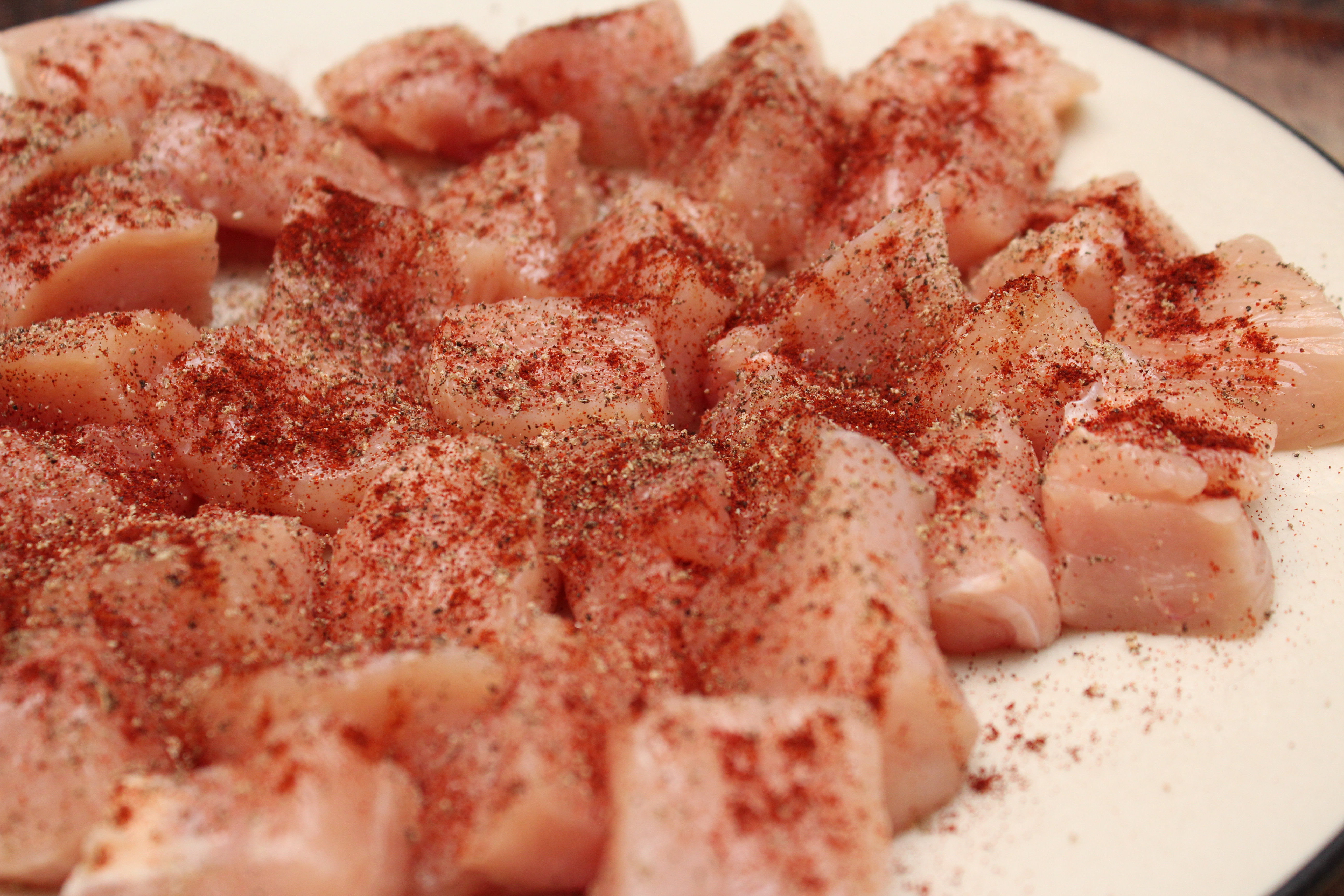 Cut the chicken into bite size pieces and liberally season with the salt, pepper and chili powder.