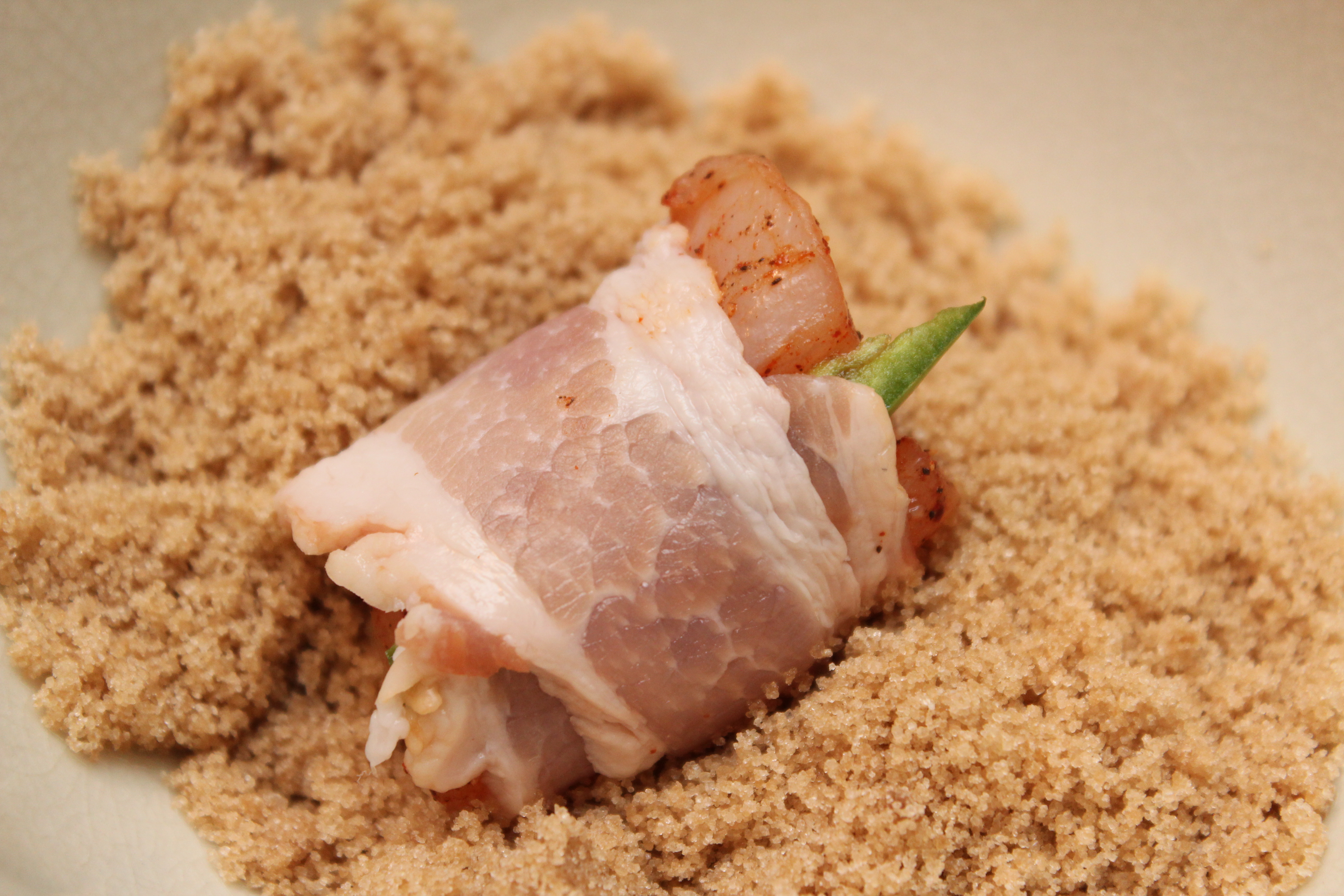 Press a sliver of jalapeño against each piece of chicken and tightly wrap with a piece of bacon.