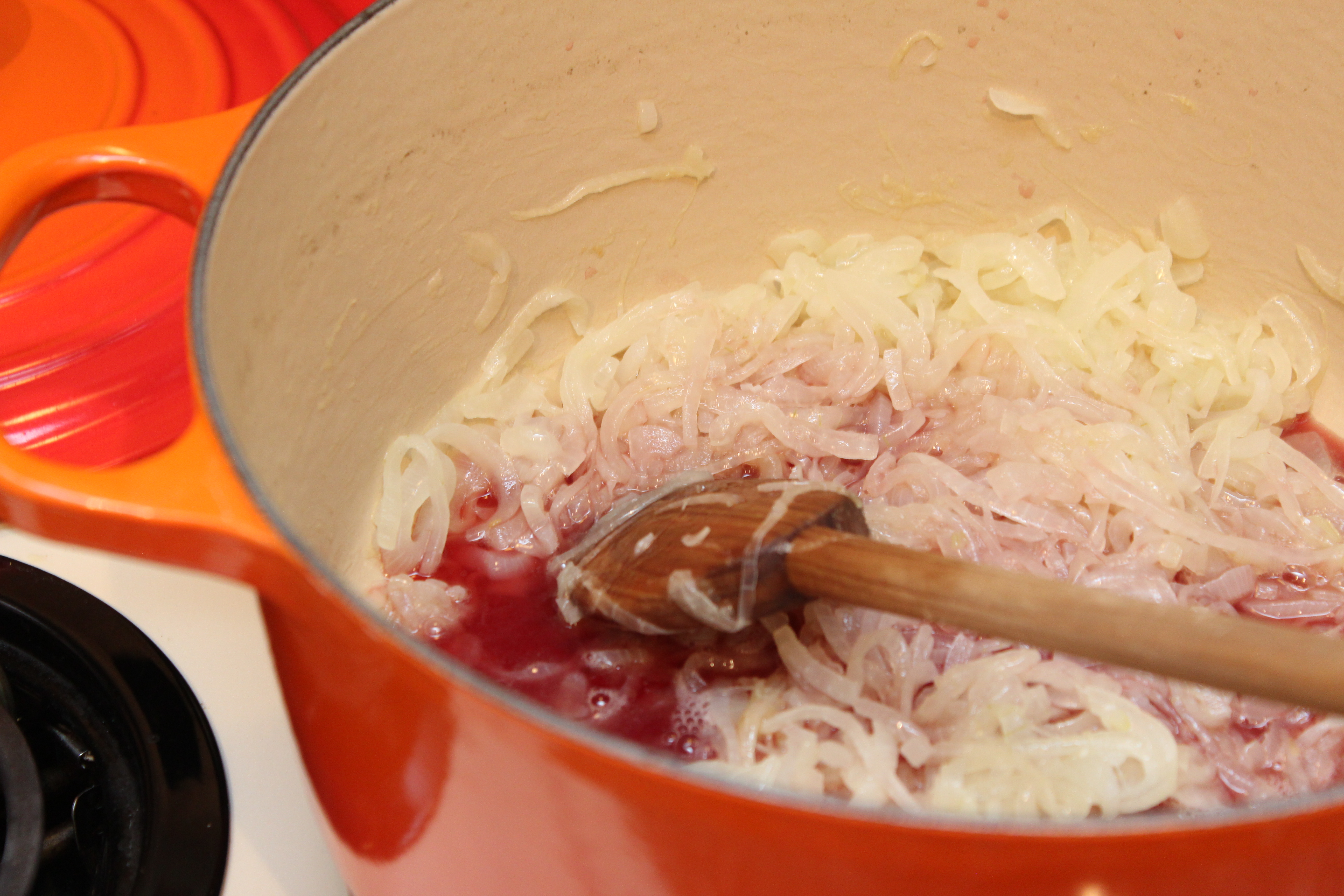 Add the remainder of the red wine and once again continue cooking and stirring until the liquid has cooked off.