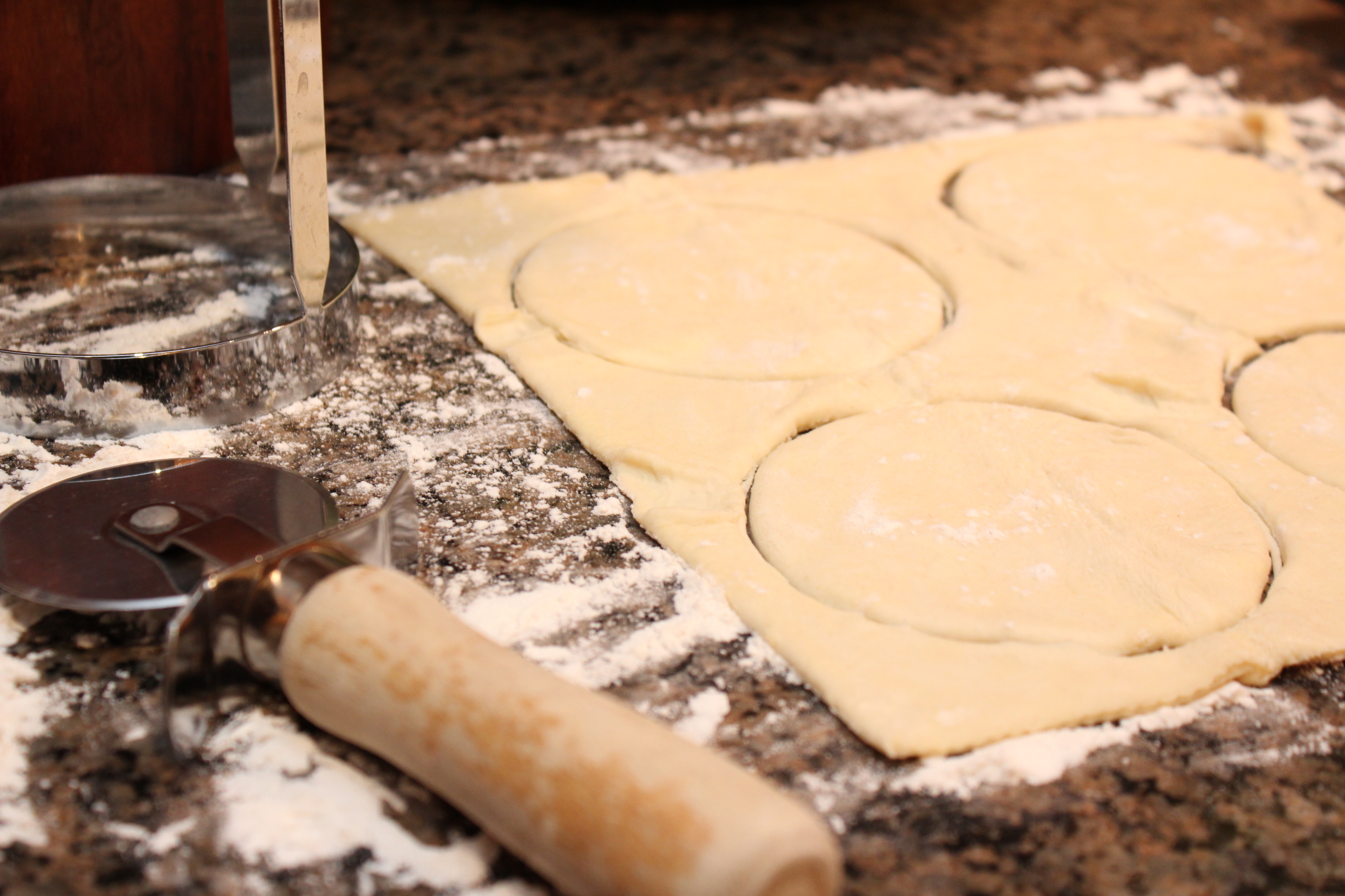 Place your puff pastry sheets on a floured surface and cut out the circles to desired size. You could also cut the pastry into 4 squares. This way you better optimize the pastry sheet with no wastage through offcuts.