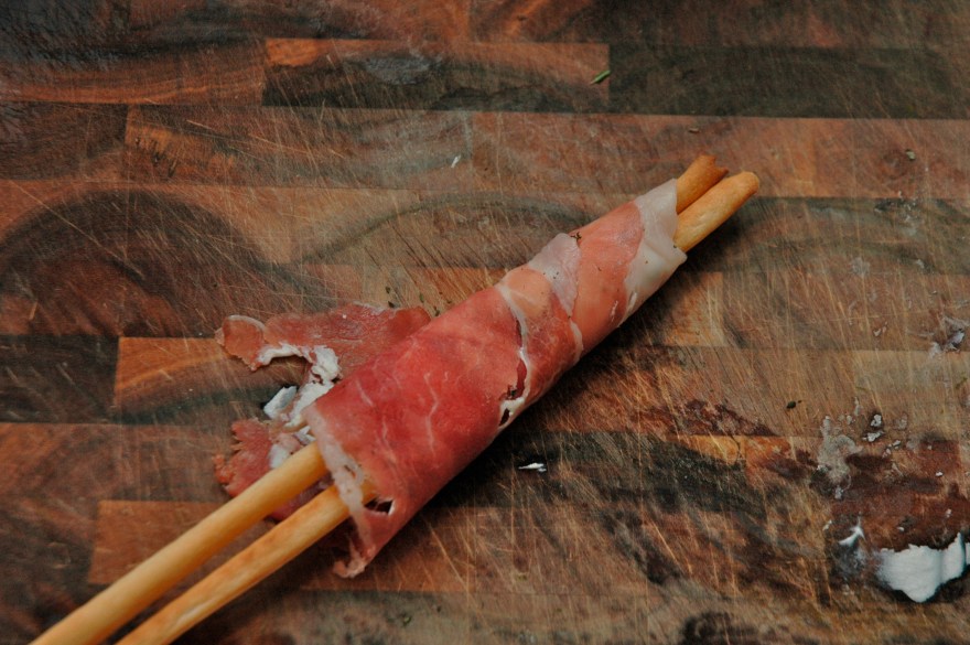 Place two Grissinis, starting at the top, on the prosciutto…