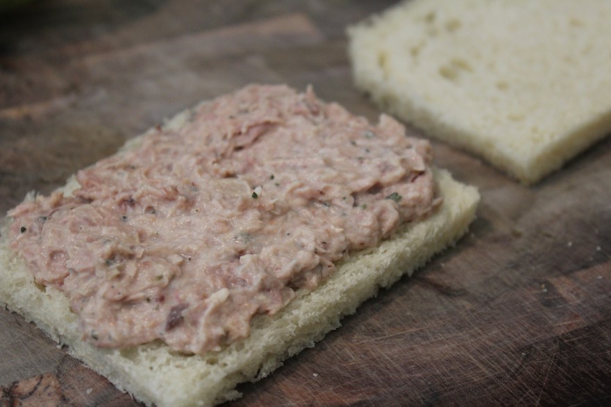 Spread a heaping spoonful of the tuna mixture onto a piece of bread.