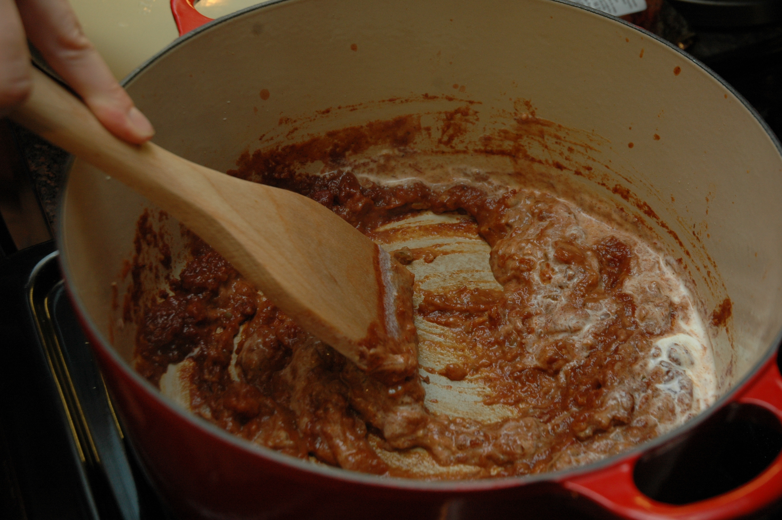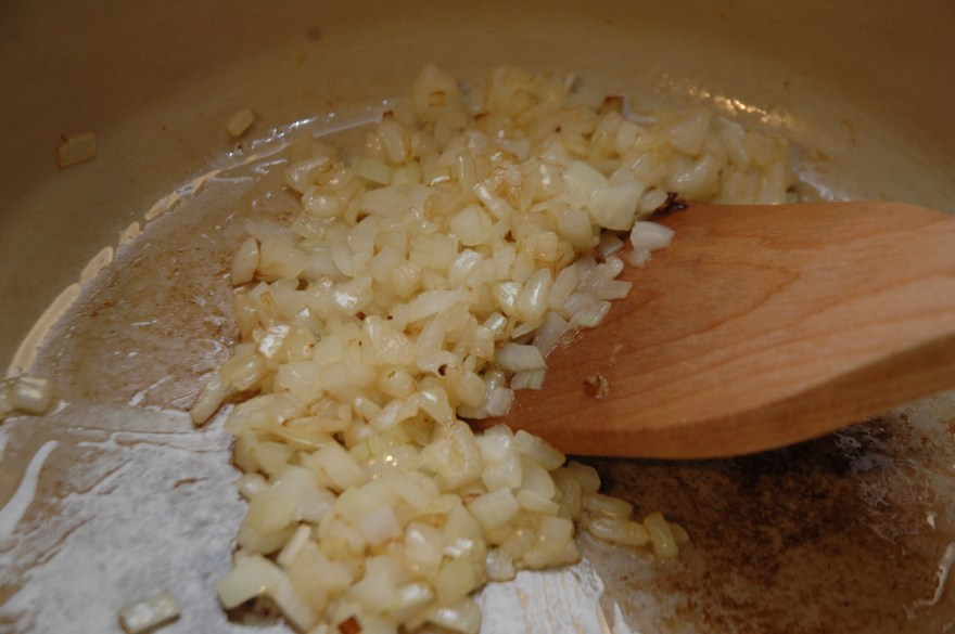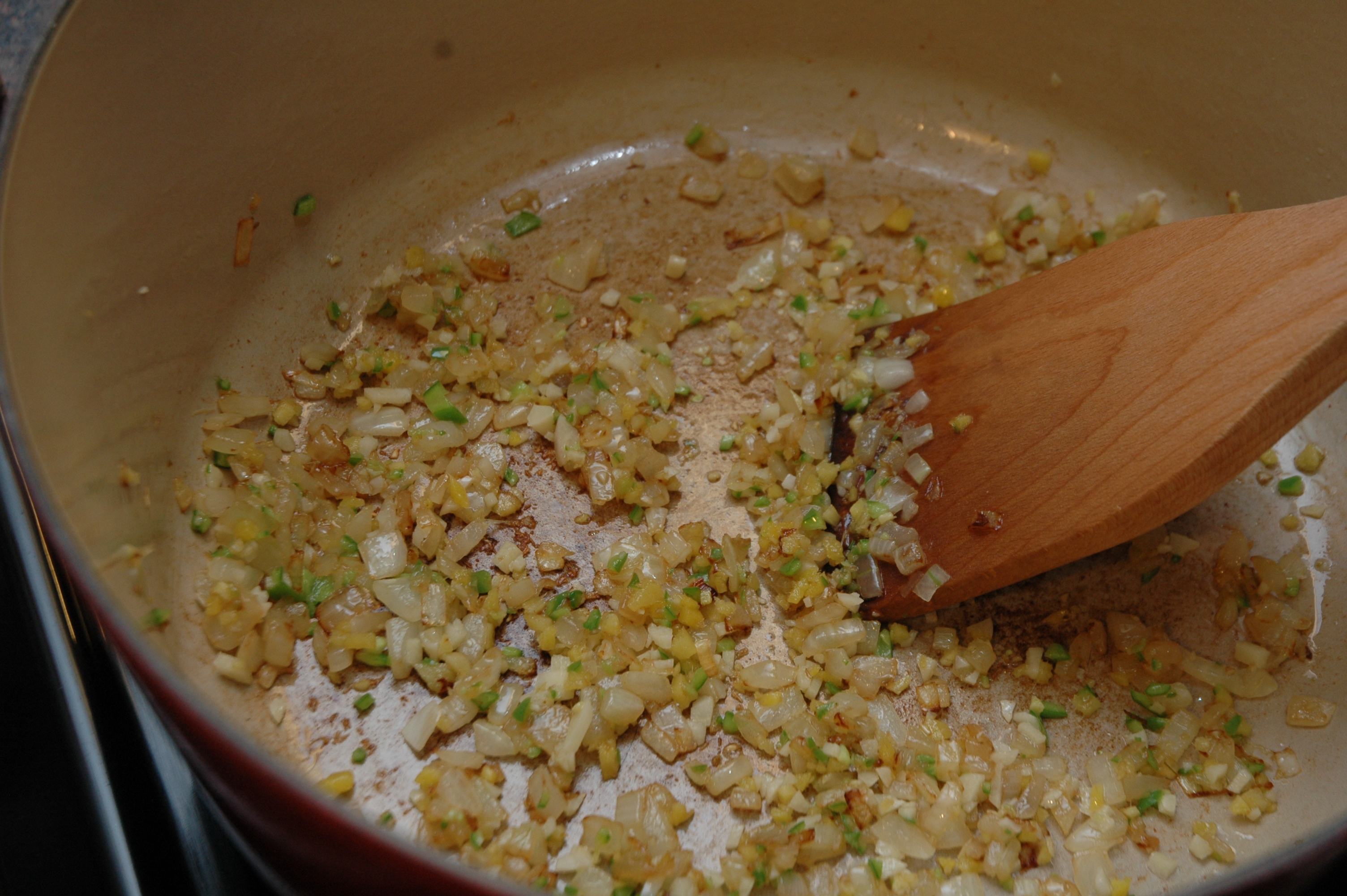 The make the sauce heat the olive oil over medium high heat in a large dutch oven. Saute the onions until translucent, around 4-6 minutes.