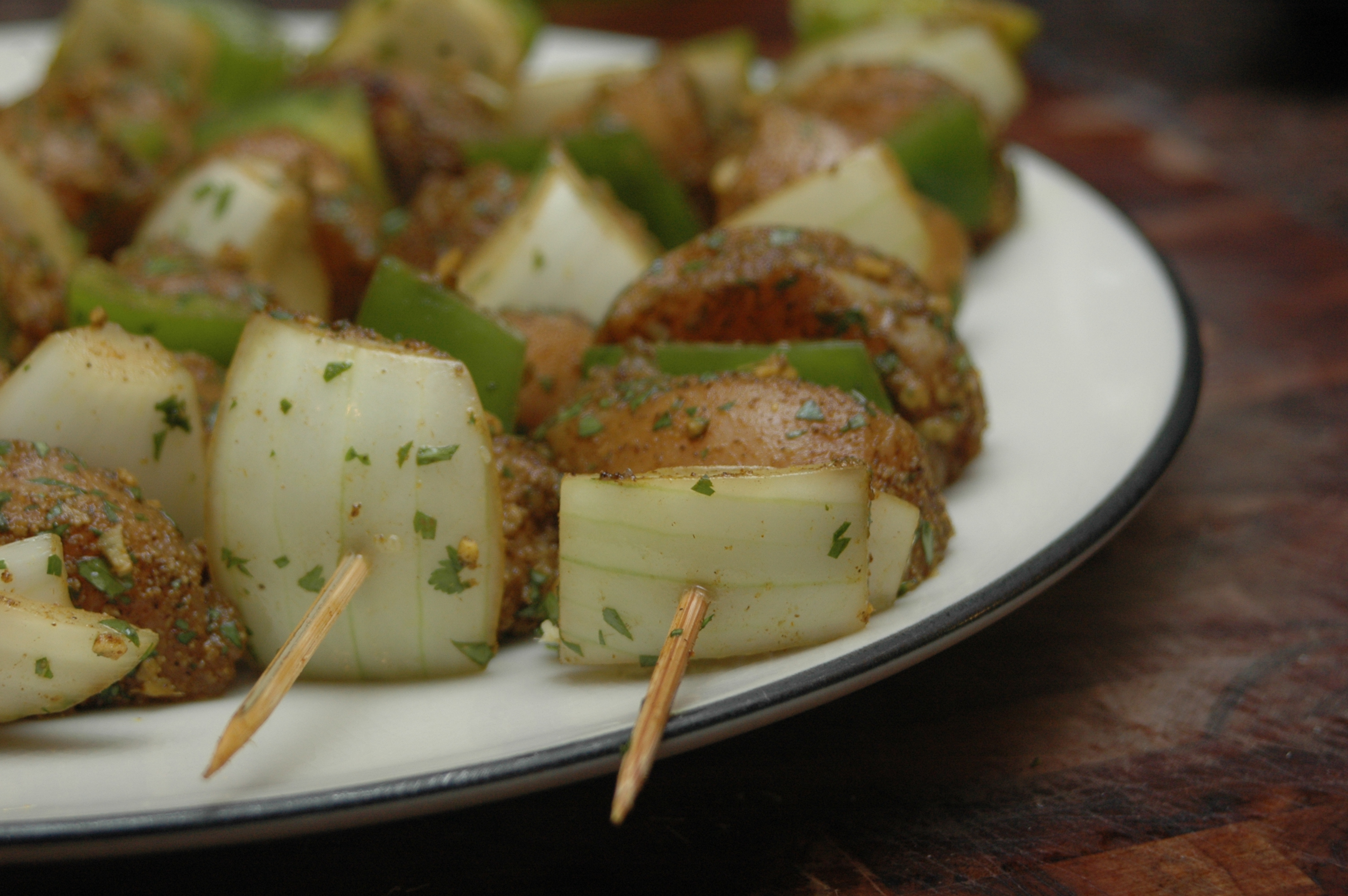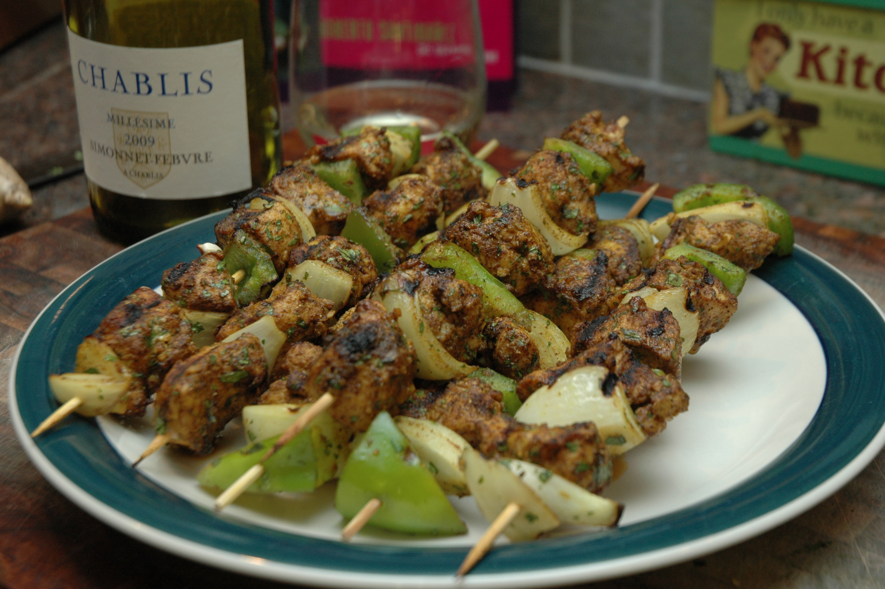 Soak 6 wooden skewers in water for 15 minutes. To prep the chicken combine all of the ingredients in a large bowl until the chicken and veggies are coated in the spice mixture.