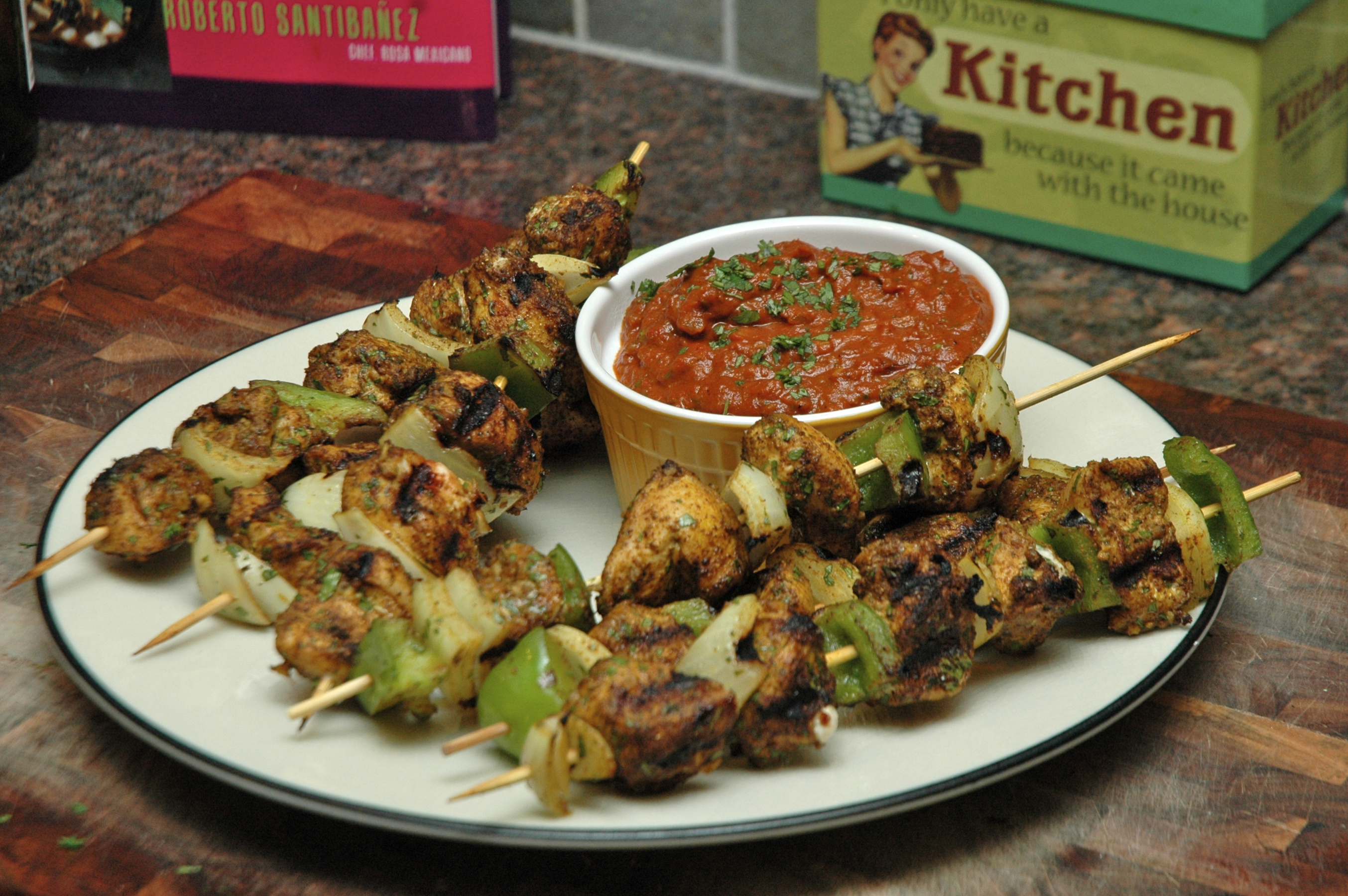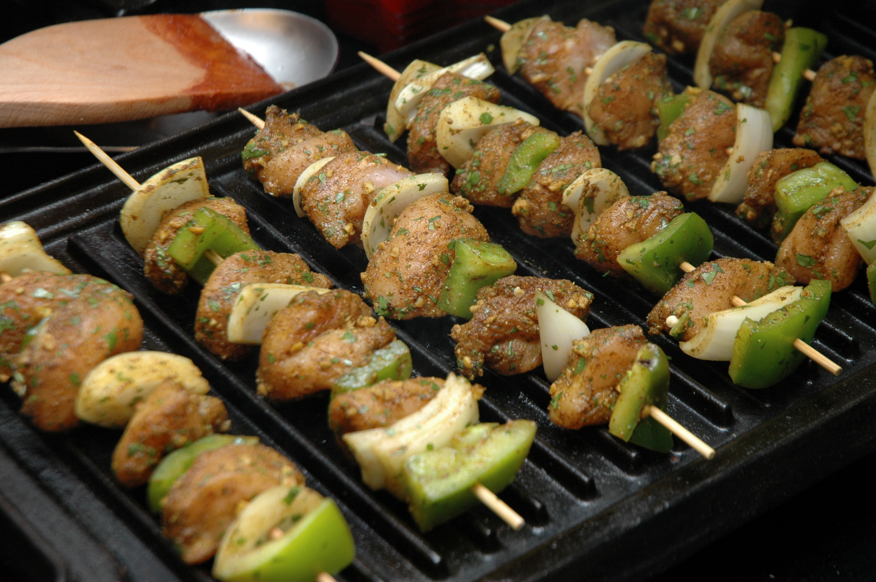 While the sauce simmers heat an outdoor grill or indoor grill top over medium high heat and add the chicken skewers.