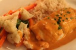 My Dinner: Sea bass coated in an amazing cream sauce on a bed of fresh arugula and grilled red onions